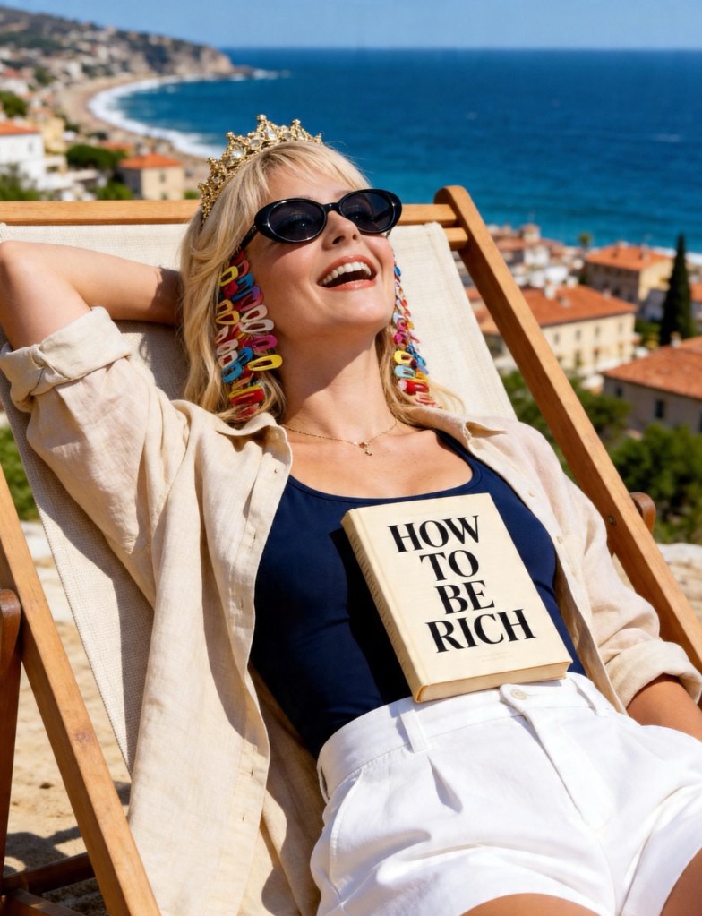 Allongée face à la mer, le soleil caressant doucement ma peau coiffée de ma fameuse couronne dorée posée comme une évidence… et ce livre sur le cœur : How to be rich…